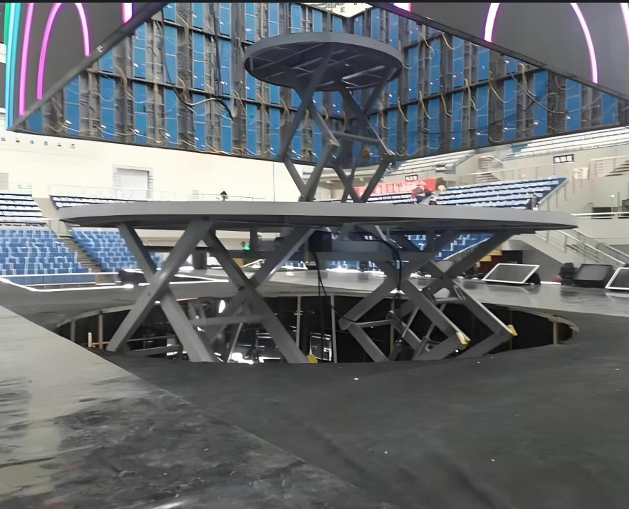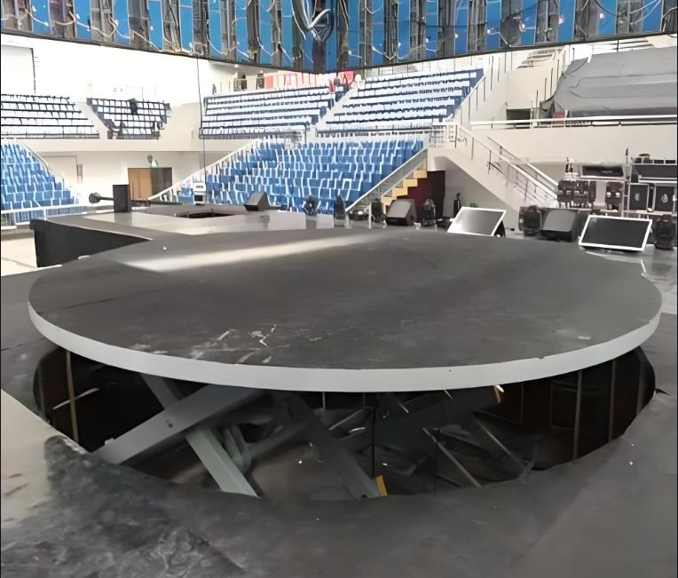 液压升降舞台也叫舞台升降机专门安装在舞台上,用于舞台升降及旋转叫舞台升降机。有升降、旋转、倾斜等多种功能,控制采用自锁、互锁、行程开关、机械限位、液压防爆等保护措施。